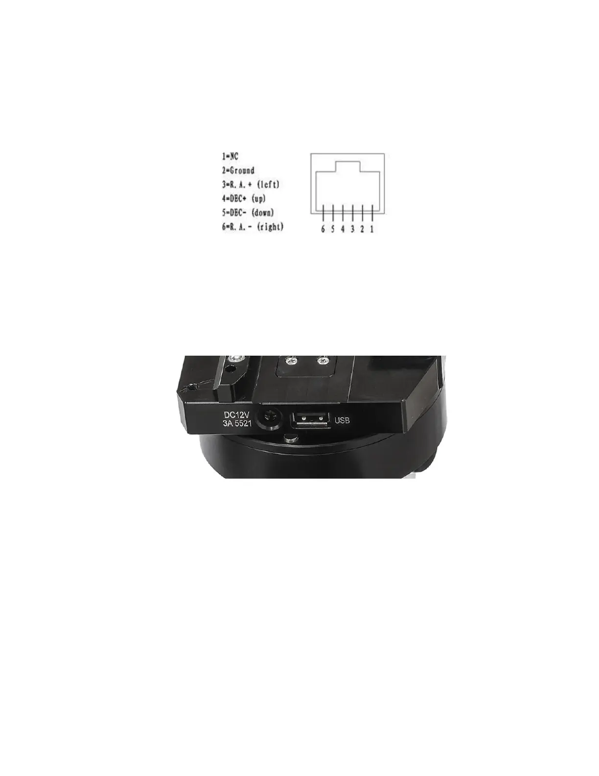 DC 12V IN: DC power socket to power the mount (5.5mmX2.5mm/5525, center positive)