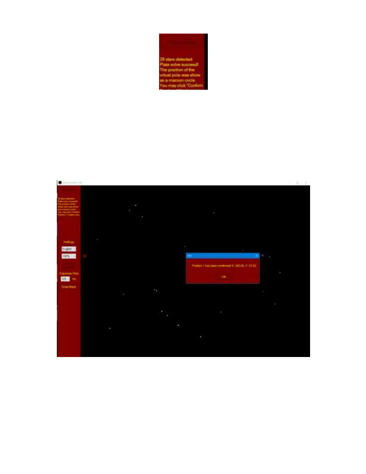 Click on OK to confirm. Do not adjust the tripod or mount ALT/AZI position after confirming position
