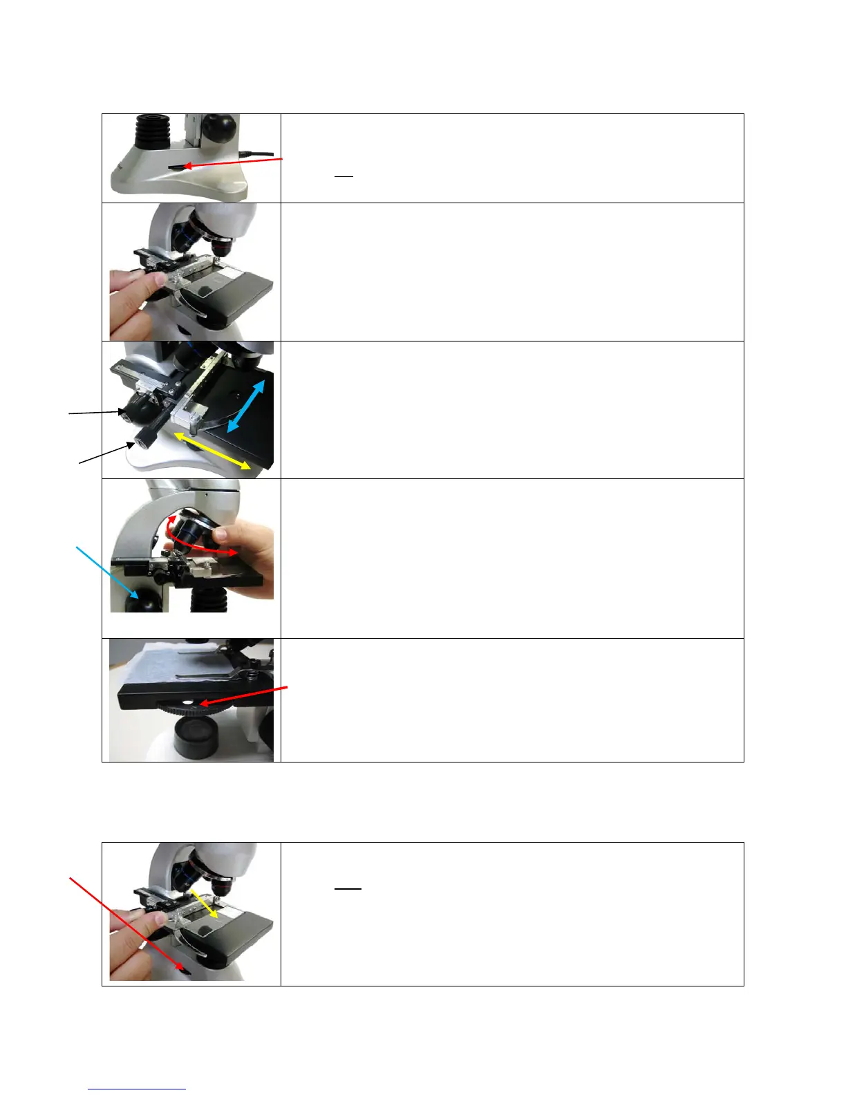 Adjust the mechanical stage “left to right” (blue arrow) or “in & out”