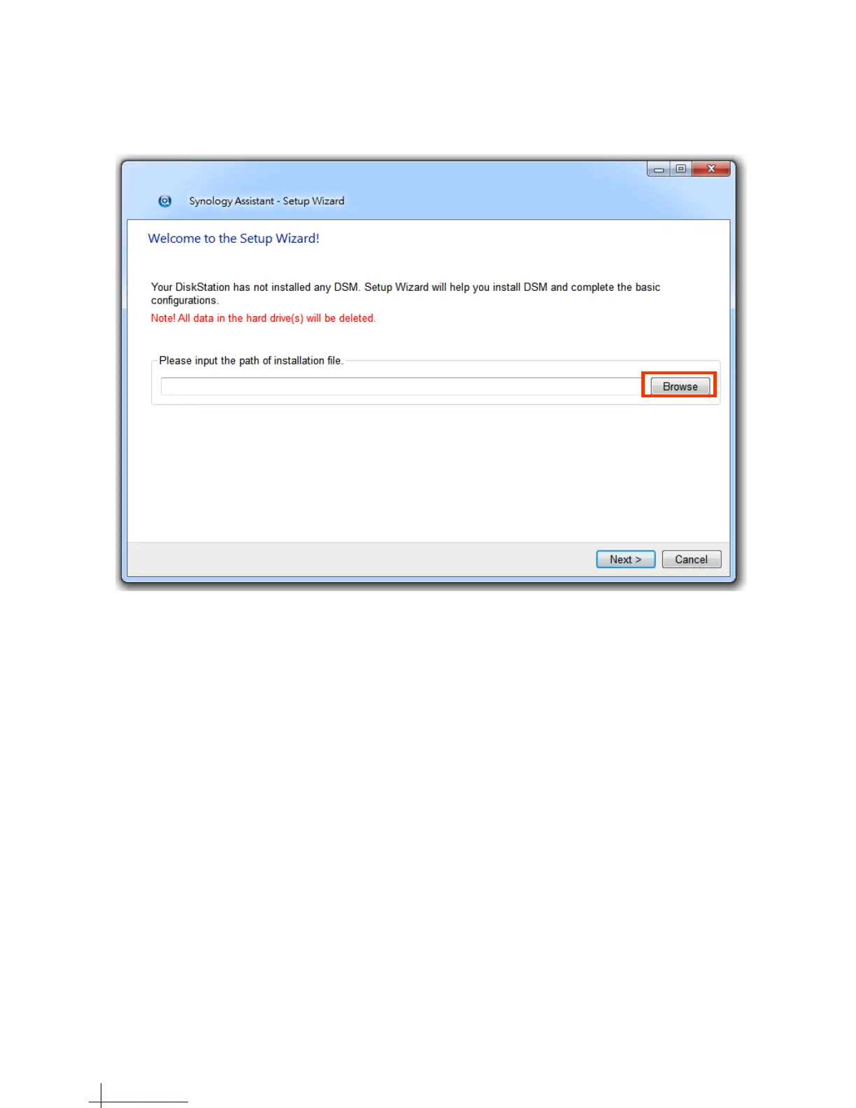 5 Click Browse to locate the DSM_[DS214]_[number].pat installation file in the DSM folder of your installation disc.