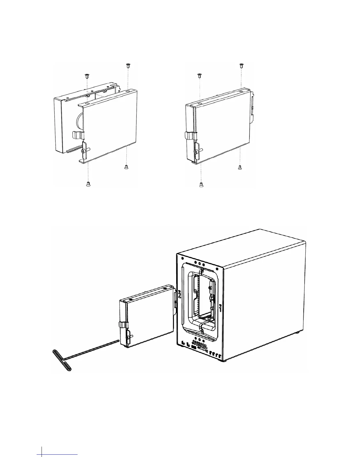 5 Insert the Hard Drives into the empty hard drive bay and tighten the screws using the 3mm Hex Tool