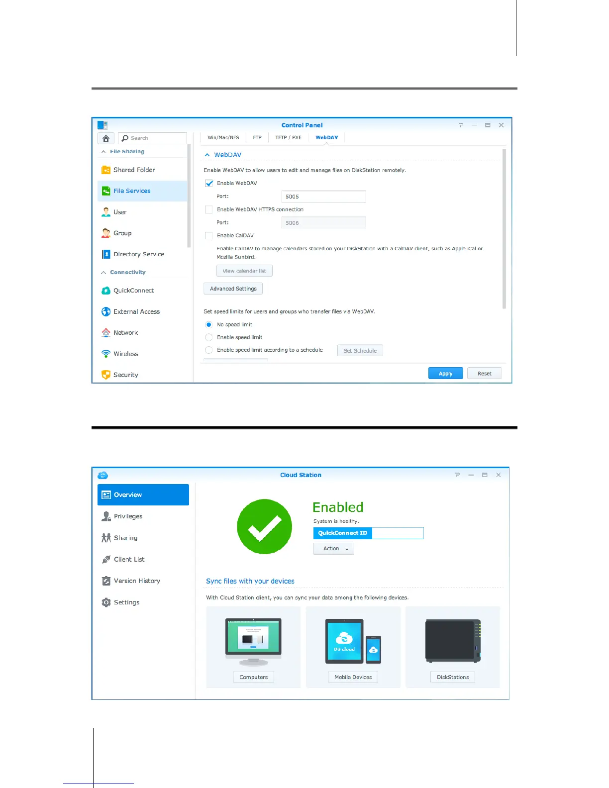 By enabling WebDAV or CalDAV (at Control Panel > File Services > WebDAV), you can remotely manage and