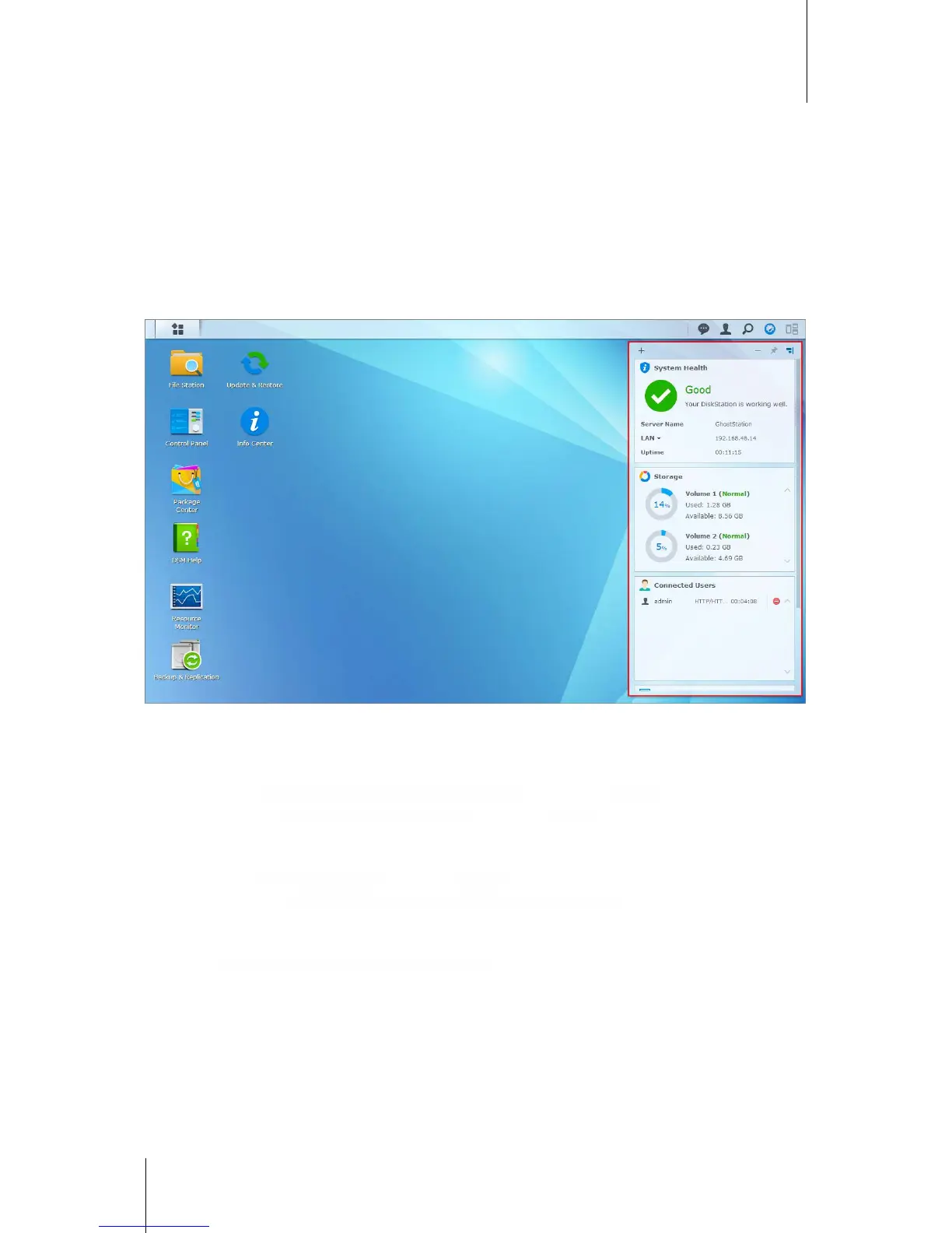 Storage: View the volume usage and disk status of your IoSafe NAS.