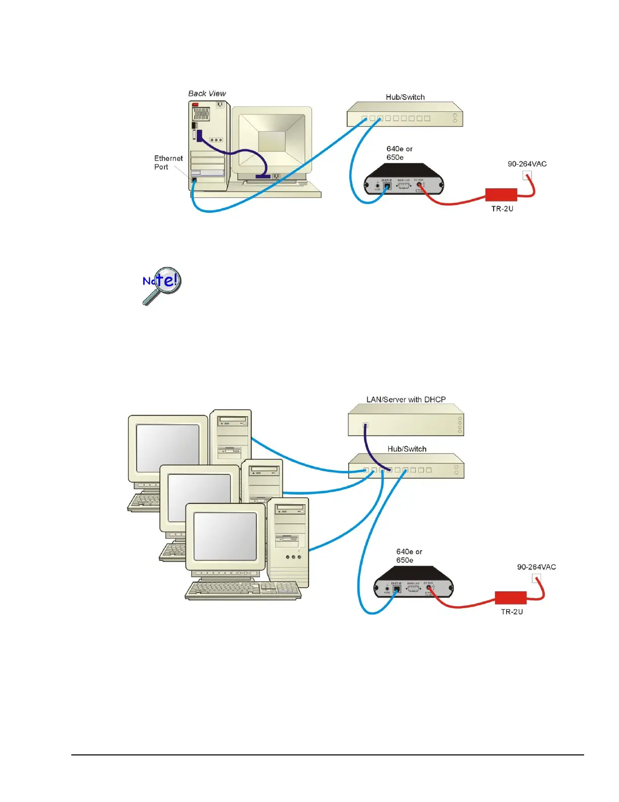 In this scenario the 640e or 650e connects to the Ethernet through a network hub or switch. At least one