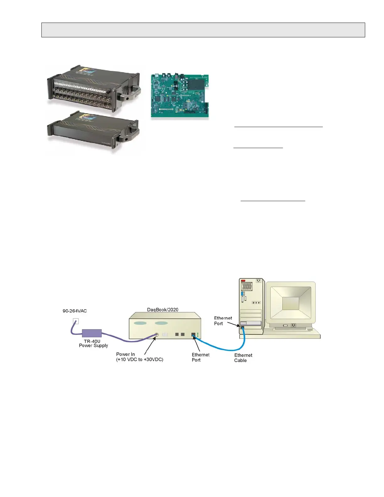 Though the following figure represents connecting a DaqBook/2020 to a PC and to power, note that the Ethernet ports