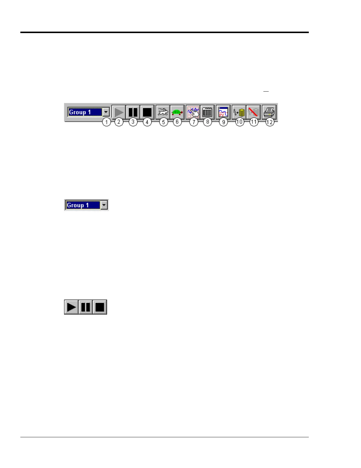 Each item in the toolbar, with exception of Group Select (1), is represented by an individual button