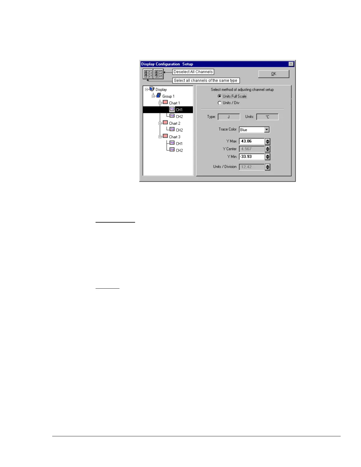 chart when the channel is selected. When you change either parameter, Y Center and Units/Division