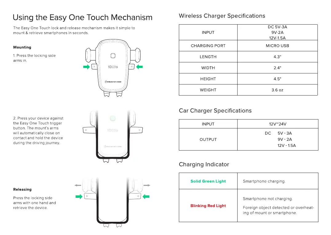 iOttie Easy One Touch Wireless 2 - Using the Easy One Touch Mechanism; Mounting and Releasing; Wireless Charger Specifications; Car Charger Specifications