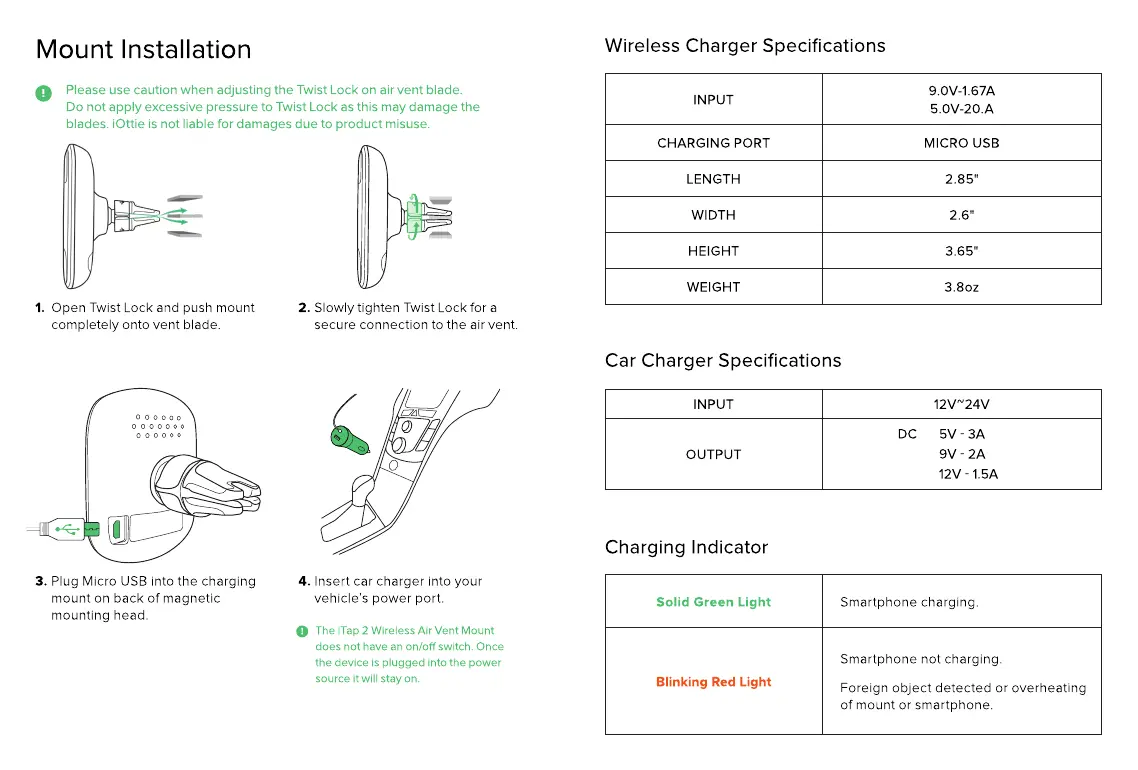 iOttie iTap 2 Wireless - Mount Installation; Wireless Charger Specifications; Car Charger Specifications; Charging Indicator