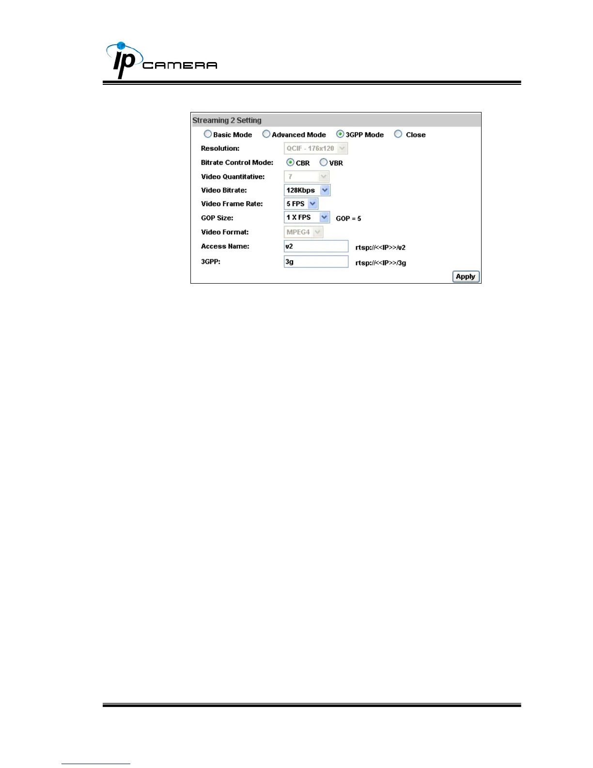 3GPP mode suggest setting: QCIF, lower than 128kbps, 5FPS, GOP= 1x FPS or 2x