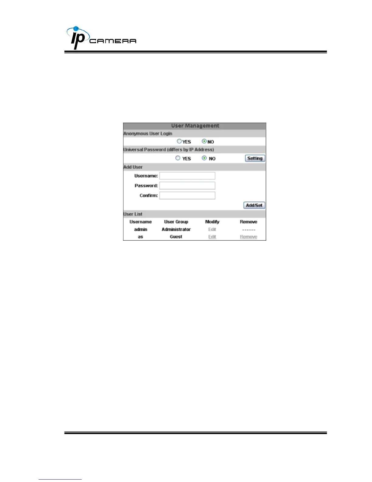 The IP Camera supports three different users, administrator, general