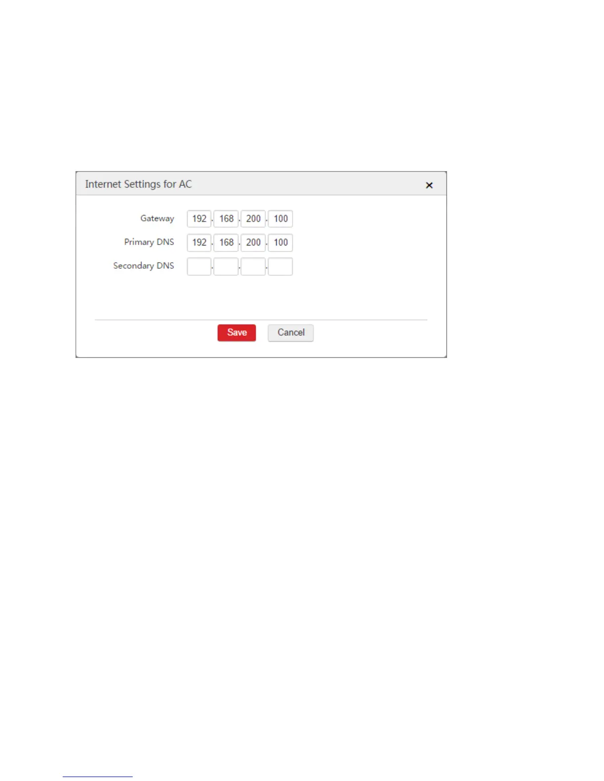 Gateway: Set the IP address of the default gateway of the AC, which is ""192.168.200.100" in this