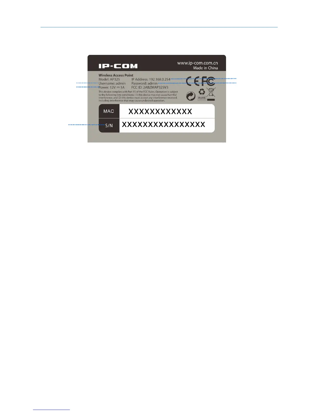The bottom label shows the AP’s default IP address, login username and password, input DC power supply,