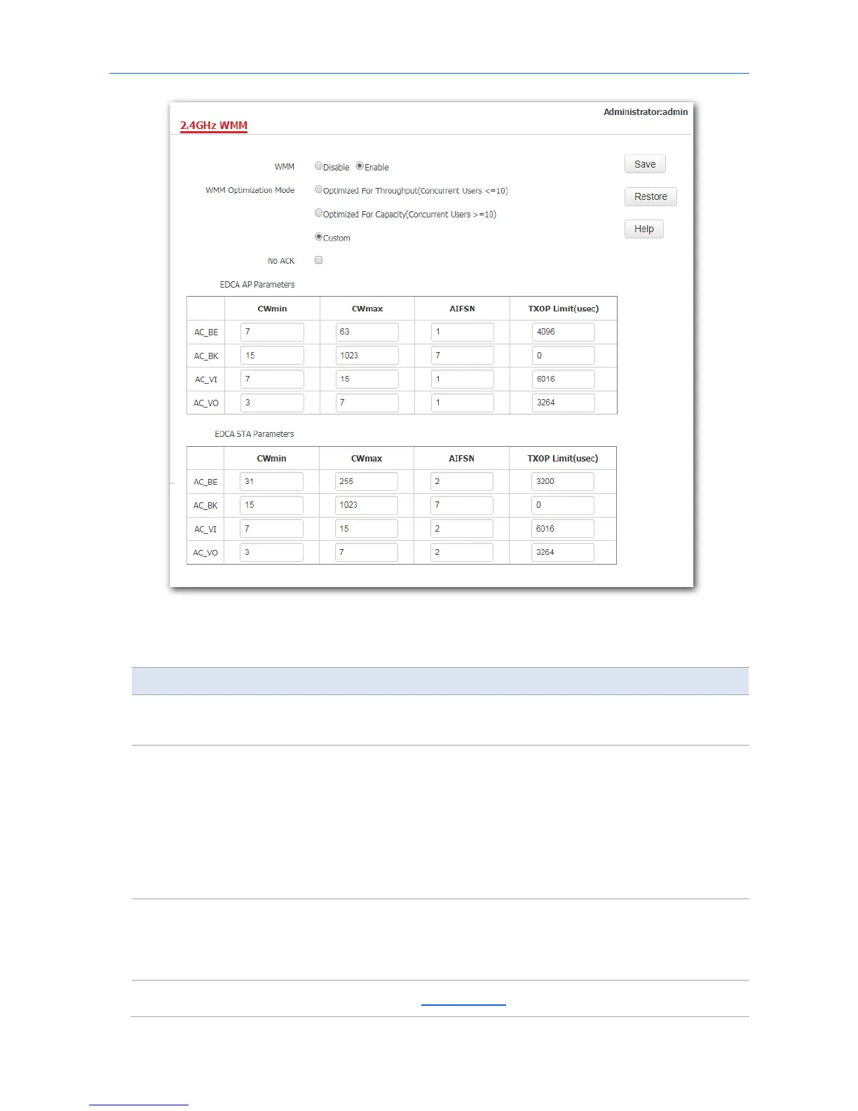 Custom: This mode enables you to set the WMM EDCA parameters for