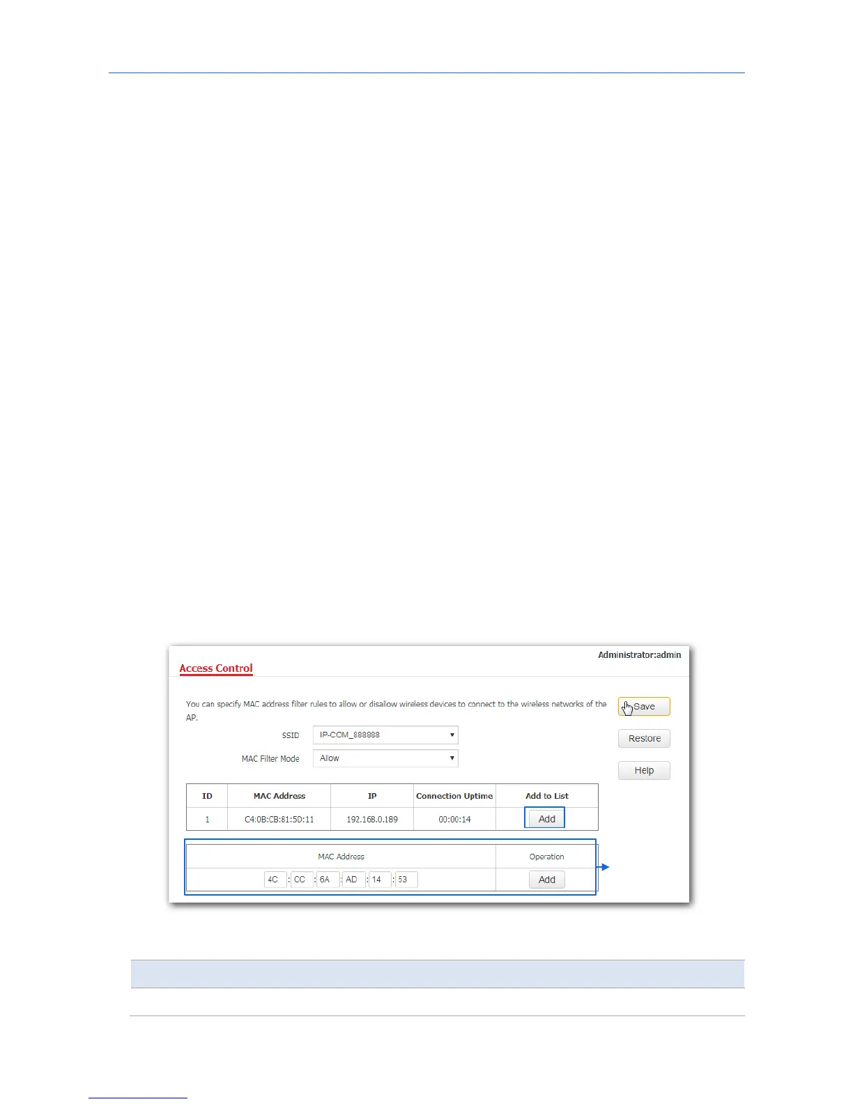 − Allow: It indicates that only the wireless devices with the specified MAC addresses can access the