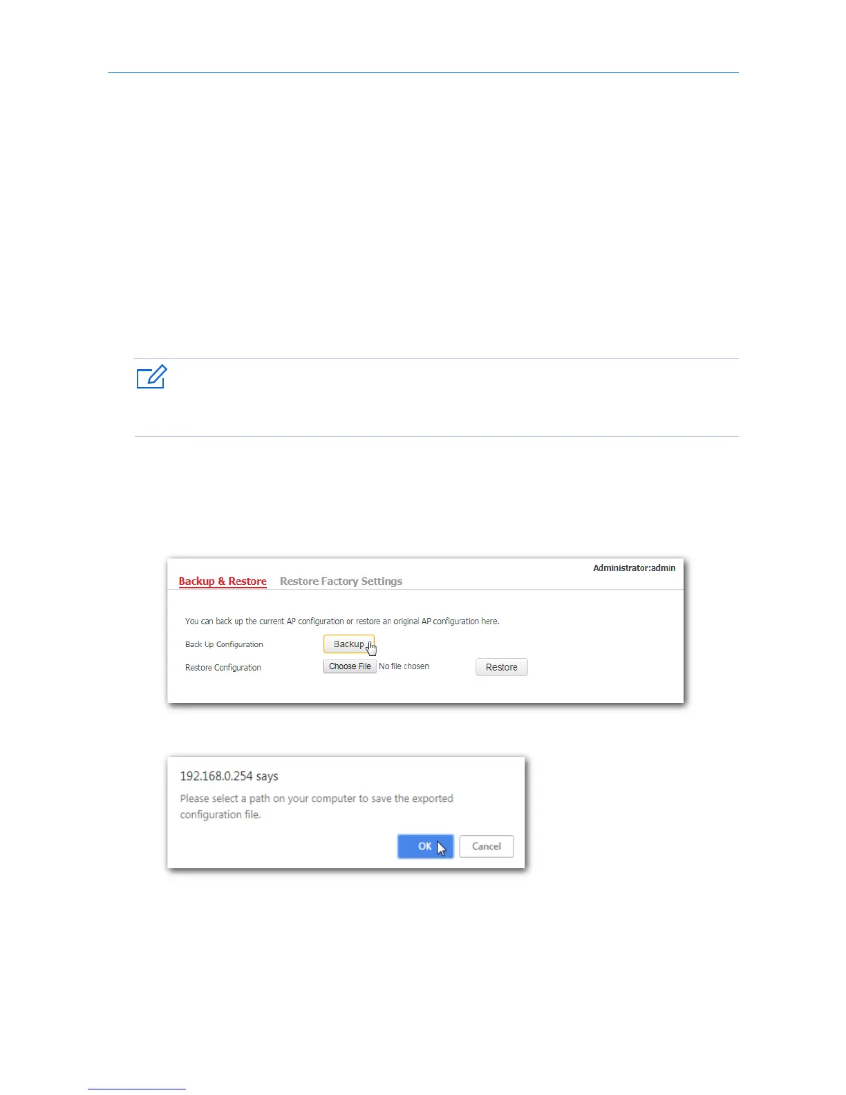 The backup function enables you to back up the current configuration of the AP to a local computer. The