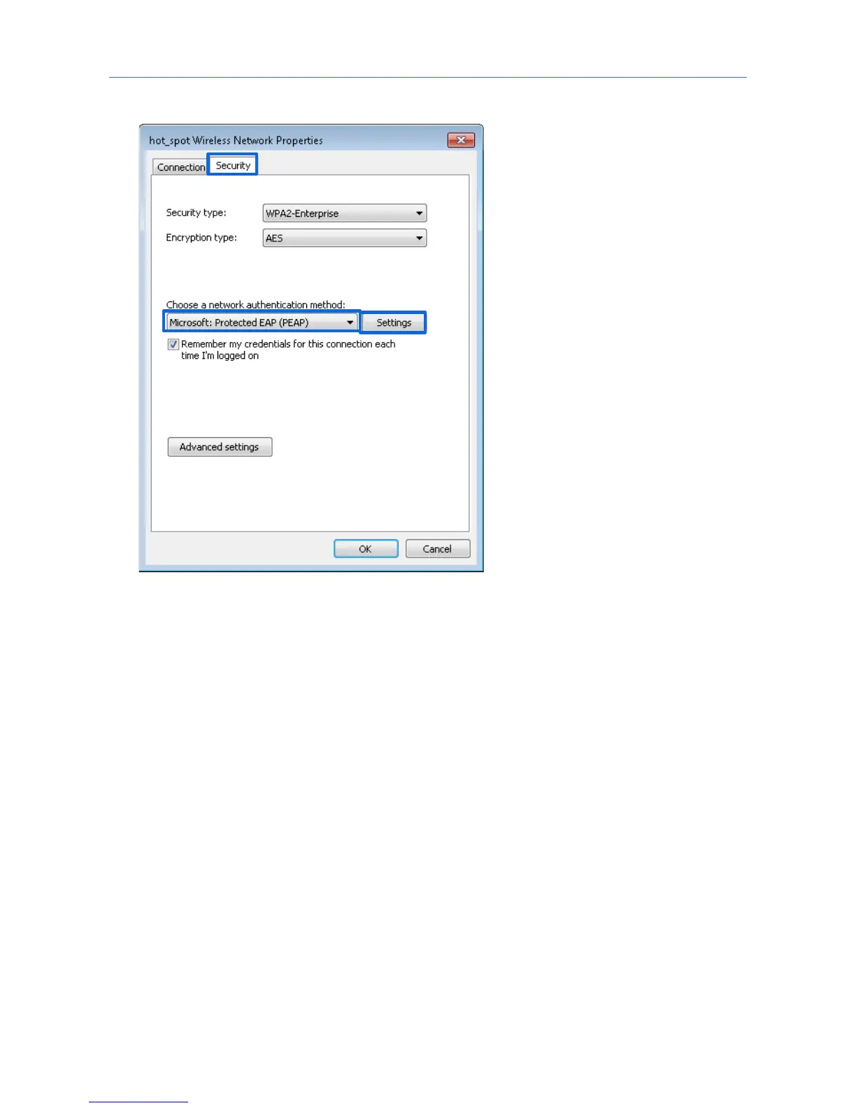 Click the Security tab, select Microsoft: Protected EAP (PEAP), and click Settings.