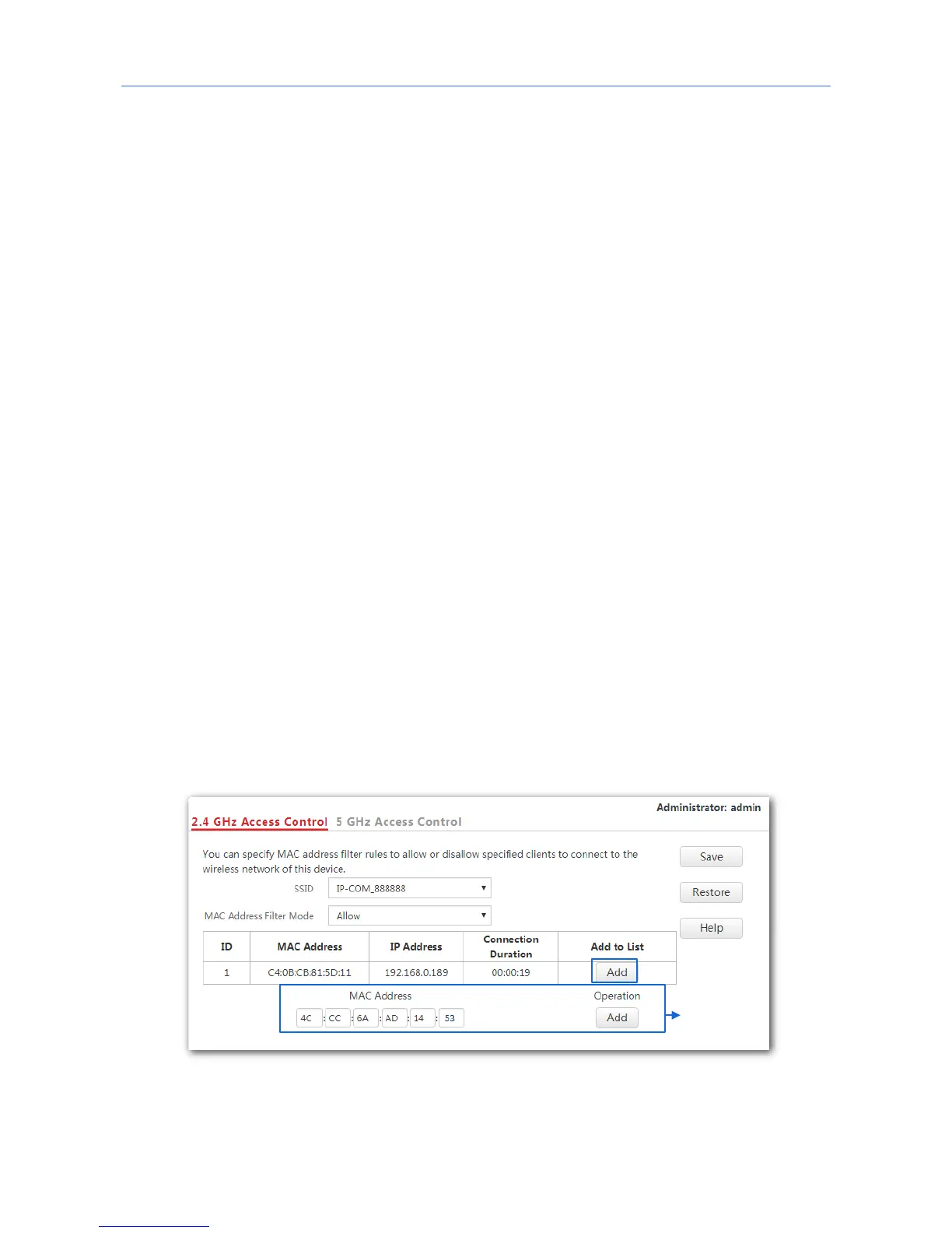− Allow: It indicates that only the wireless devices with the specified MAC addresses