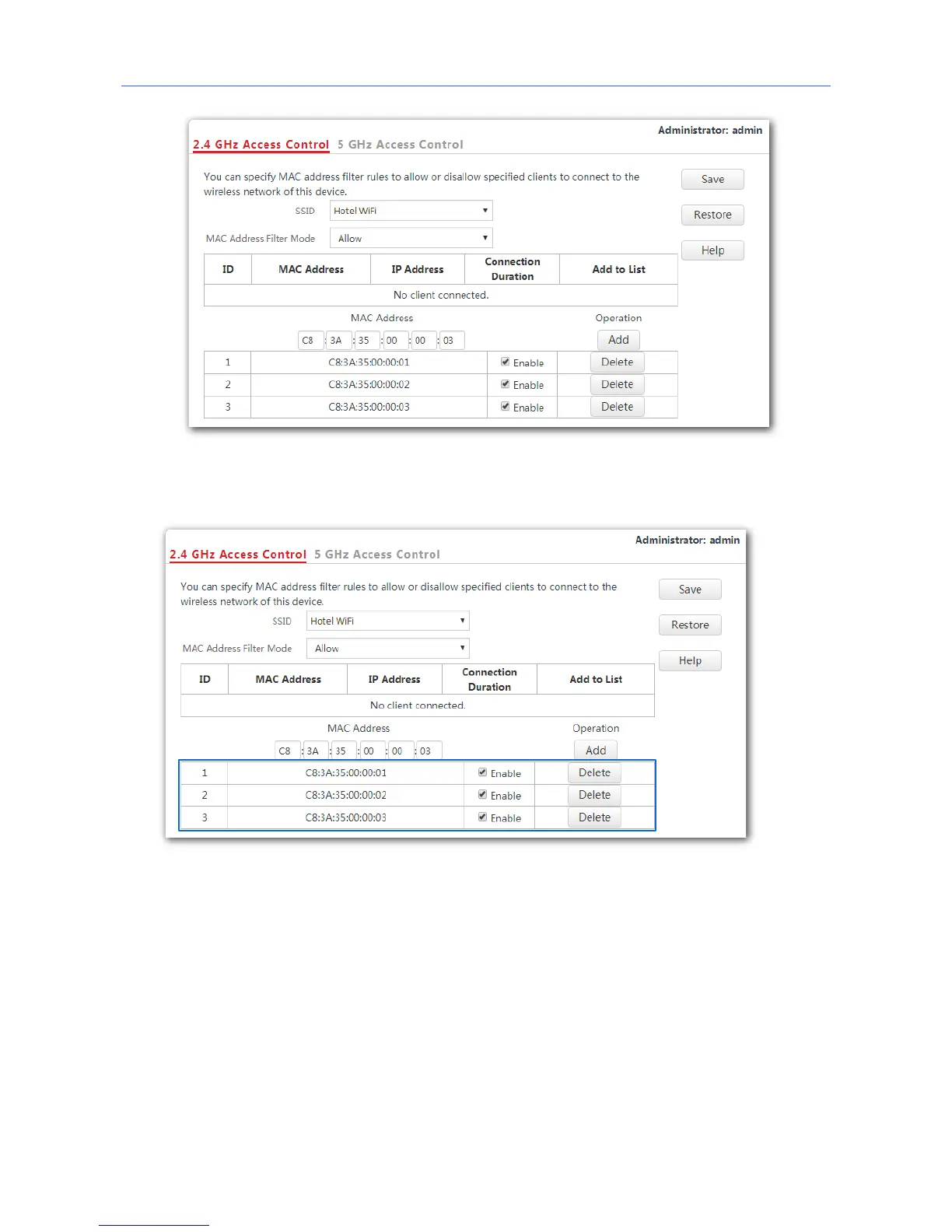 Only the three wireless devices on the access control list can connect to the Hotel WiFi WiFi