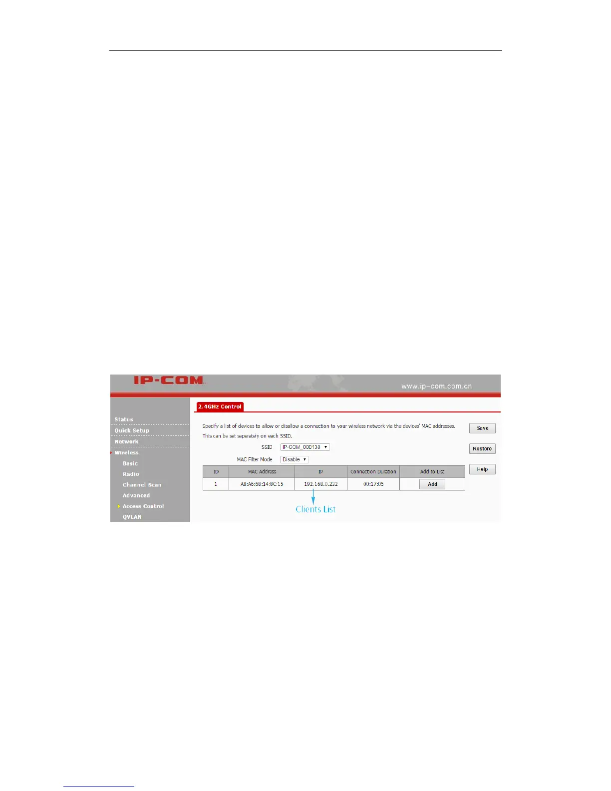 Click Wireless > Access Control to enter page below. This page allows you to specify a list of
