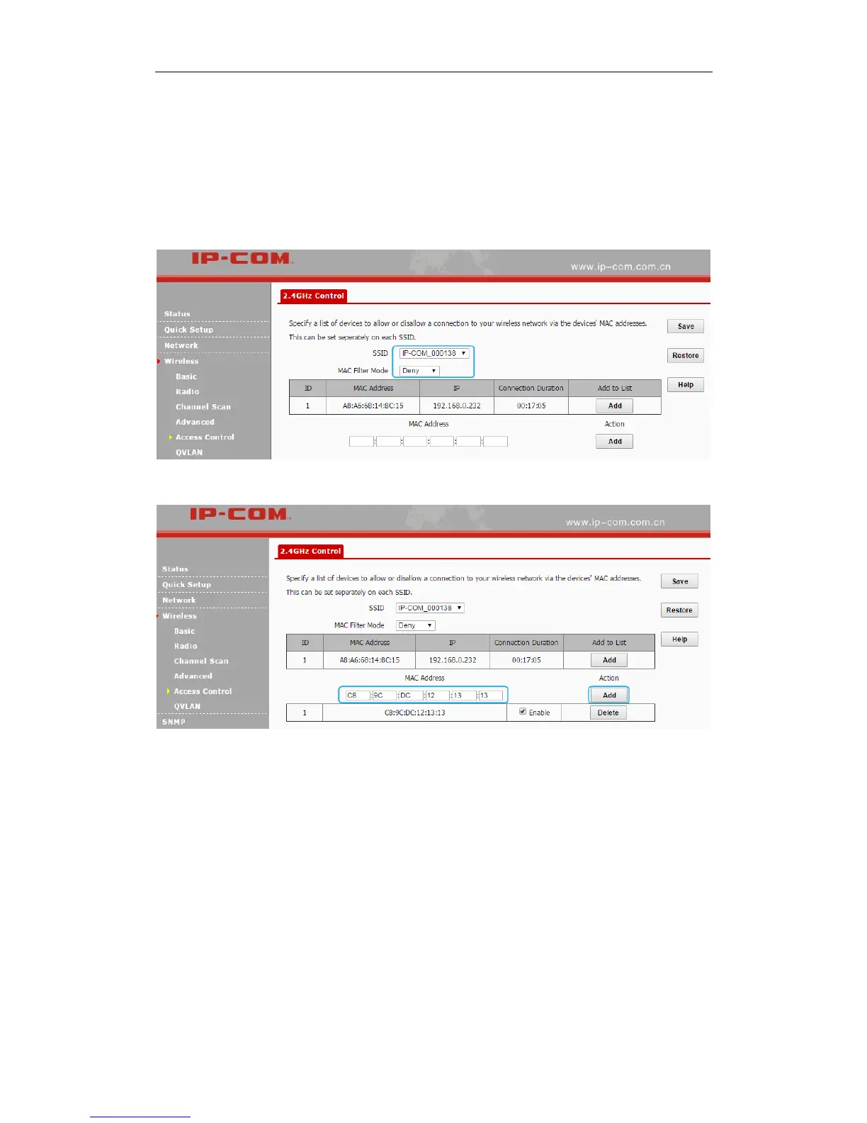 ❶ Select the SSID IP-COM_000138 and set the MAC filter mode to Deny.