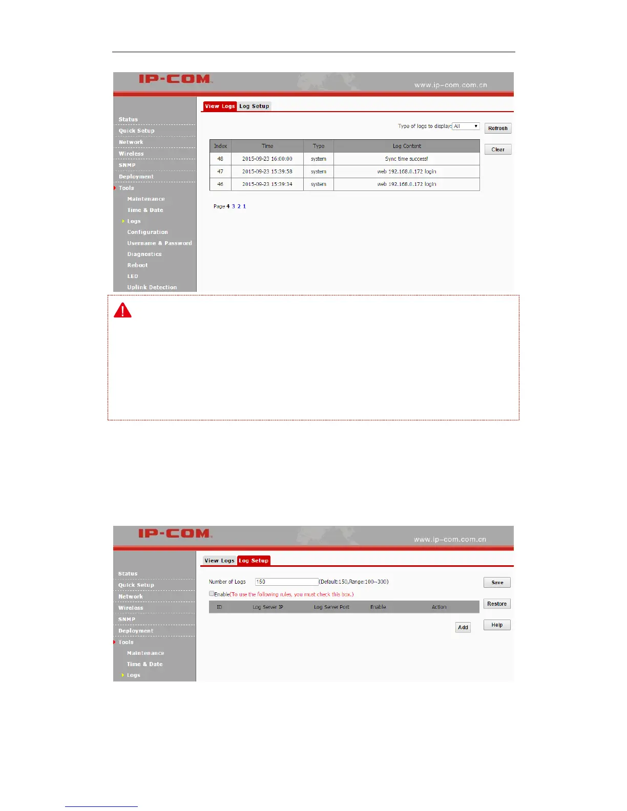 Click Tools > Logs > Log Setup to configure system logs. Here you can set up the number of logs