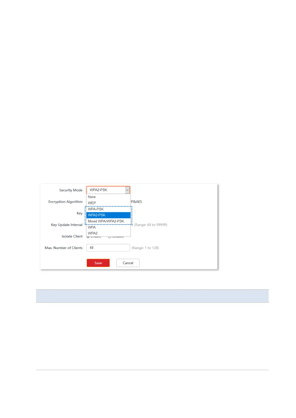 When the security mode is set to WPA-PSK, WPA2-PSK, or Mixed WPA/WPA2-PSK, the page is
