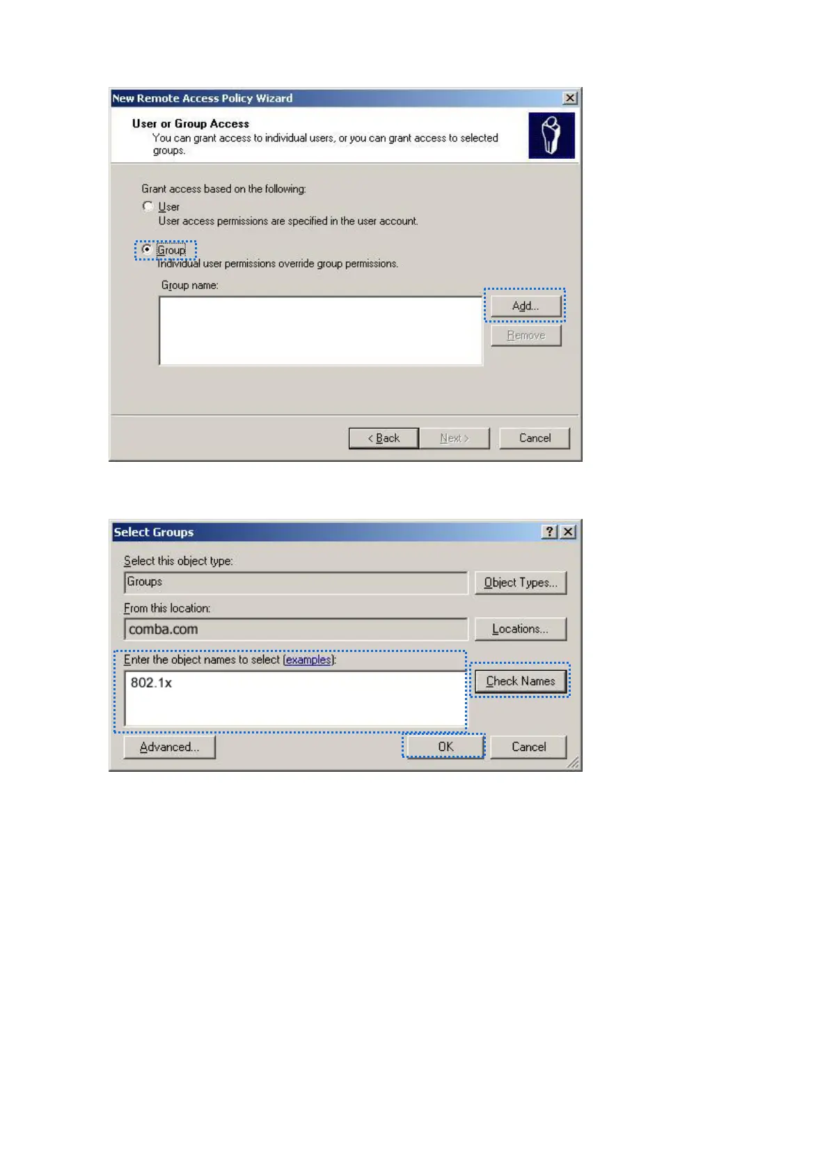 (6) Enter 802.1x in the Enter the object names to select text box, click Check Names, and