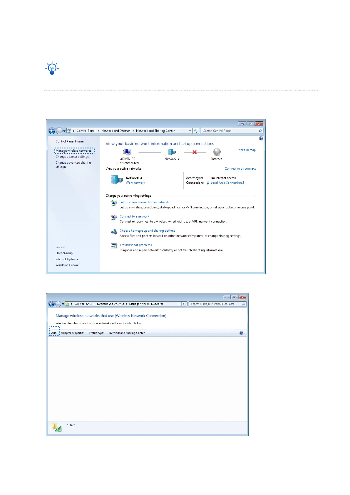 1. Choose Start > Control Panel, click Network and Internet, click Network and Sharing Center,