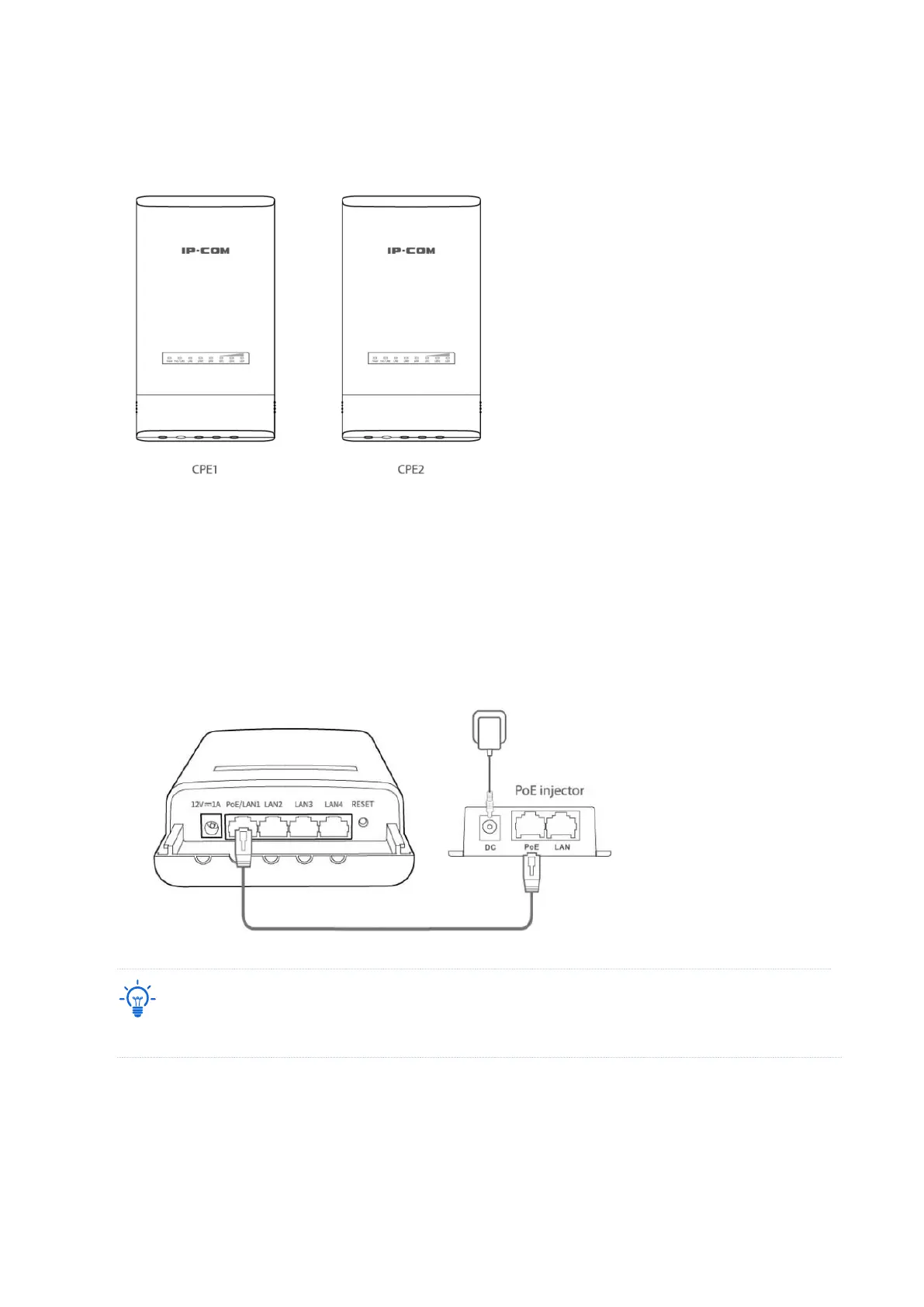 CPE1 to the PoE port of the included PoE injector to power it on.