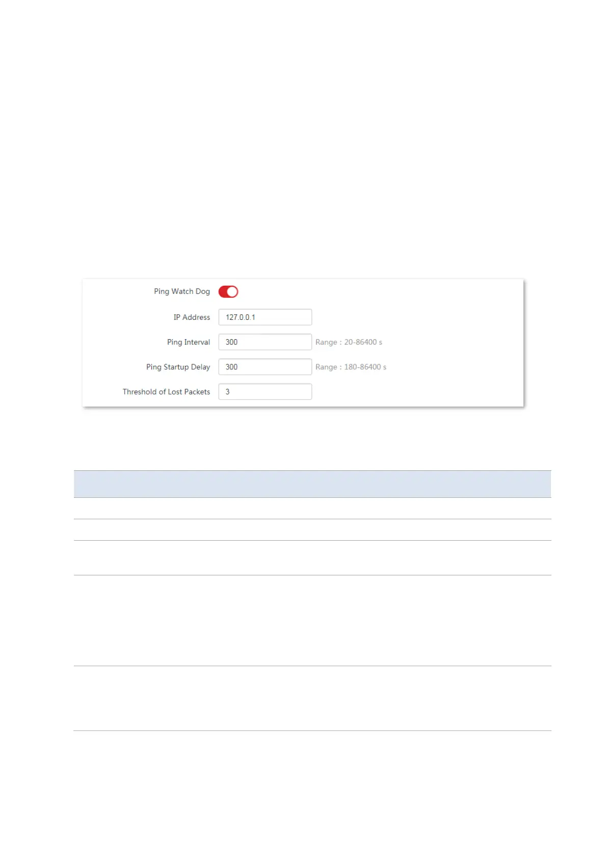 With this function enabled, the CPE periodically pings target IP address to check the network