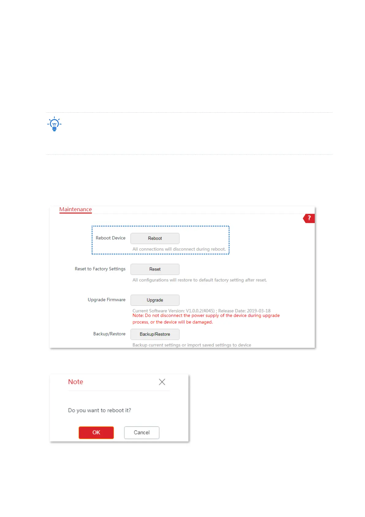 If a setting does not take effect or the CPE works improperly, you can try rebooting the CPE to