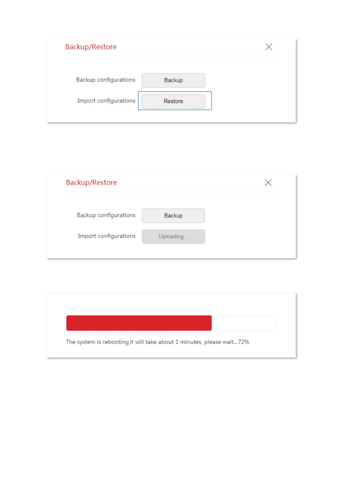 A progress bar is displayed on the page. Wait until it to complete. Then the CPE is restored the