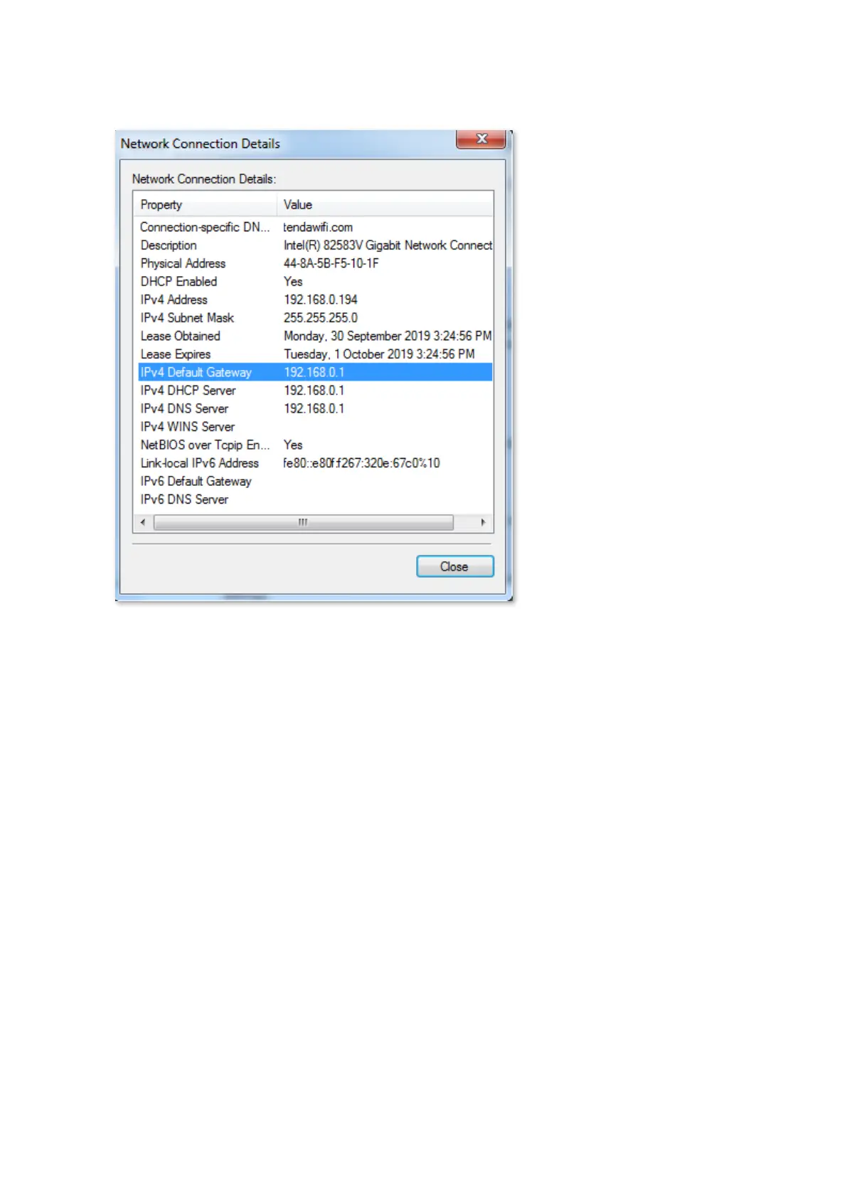 Then you can check the default gateway address on the following page.