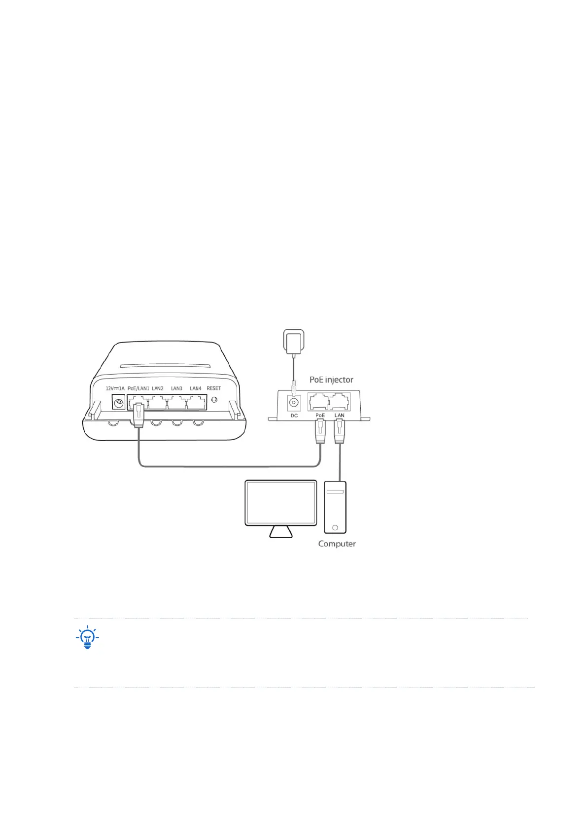 1. Connect the computer to the CPE or the switch connected to the CPE (powered by PoE in this