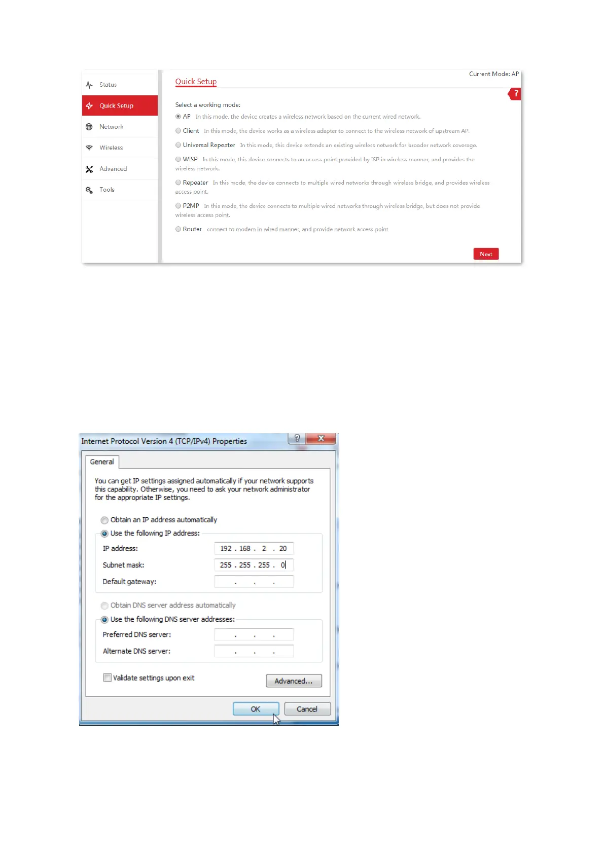 For example, if the IP address of the CPE is 192.168.2.1, you can set the IP address of the