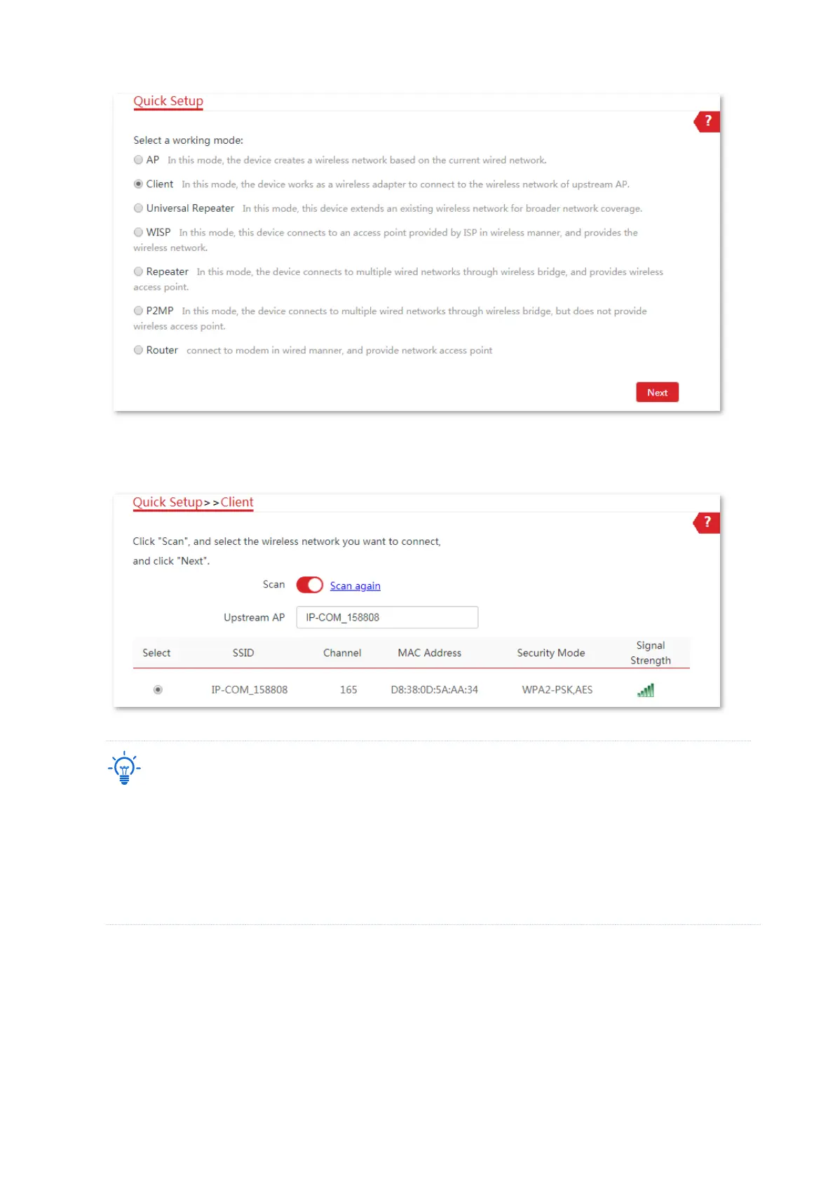 3. Select the SSID of the upstream AP, which is IP-COM_158808 in this example. and click Next at