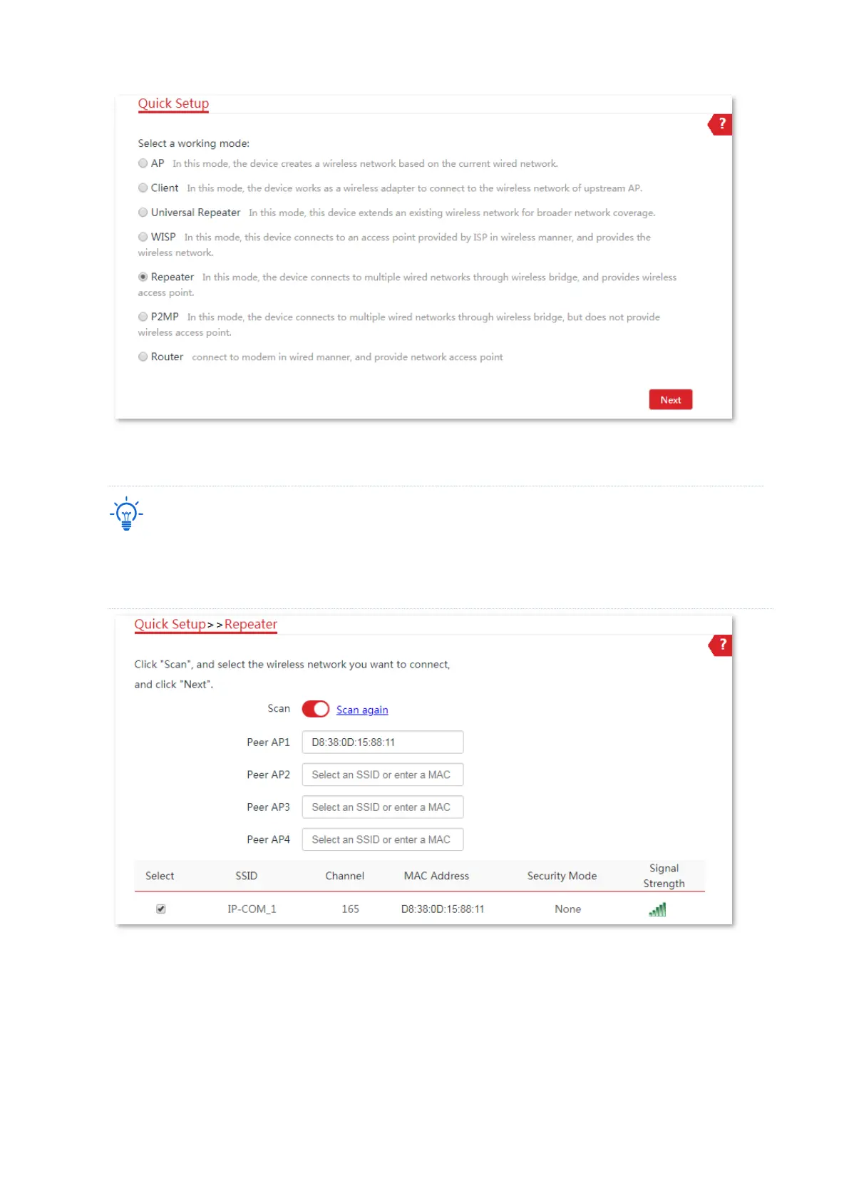 (4) Select the SSID of CPE1 from the list, which is IP-COM_1 in this example, and click Next.