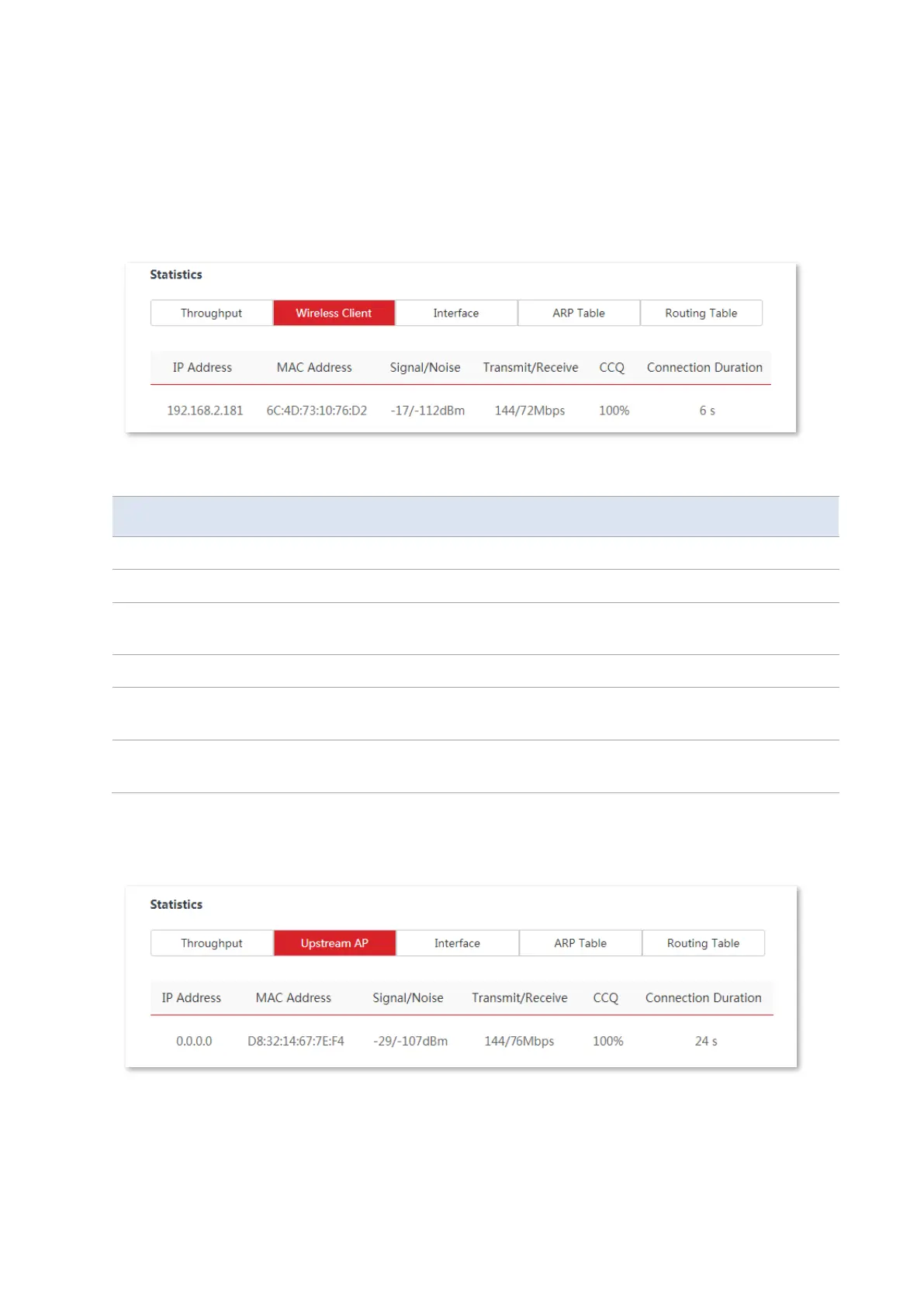 In AP, Router, P2MP or Repeater mode, it displays information of connected wireless clients.