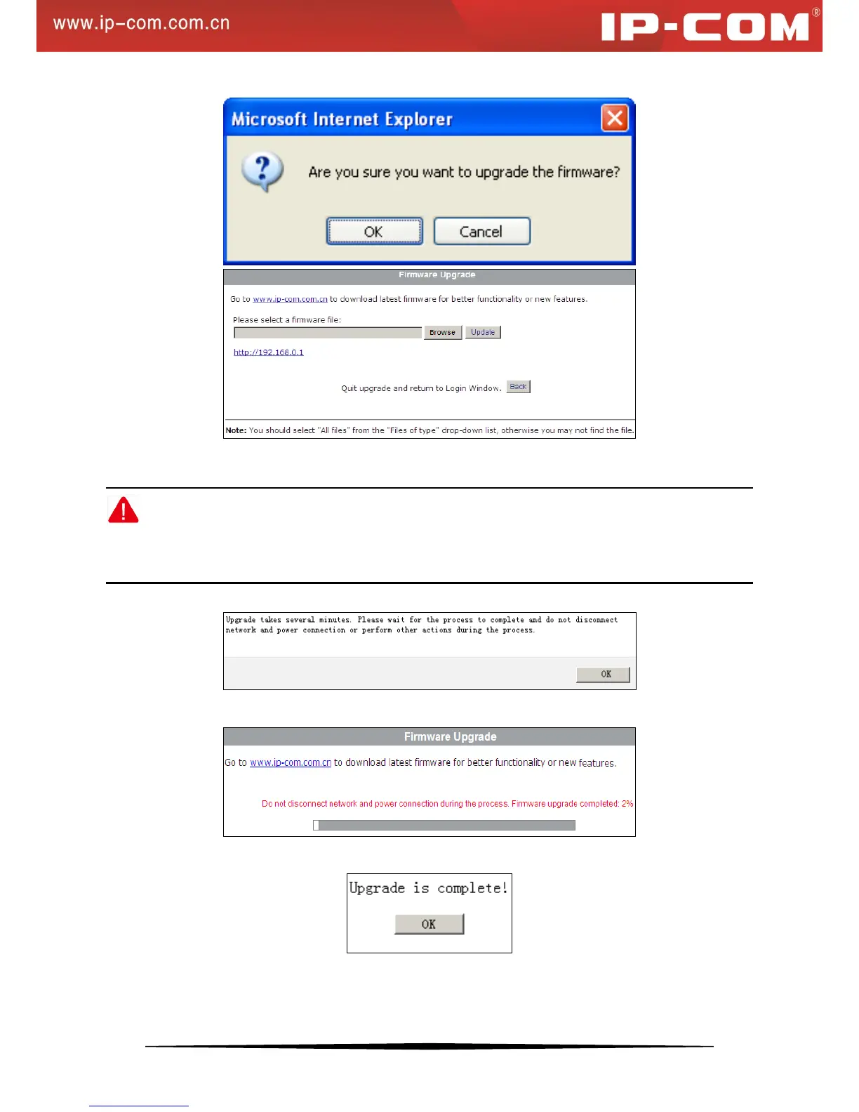 Software upgrade takes about 5 minutes. Please wait for the process to complete and do not disconnect network and