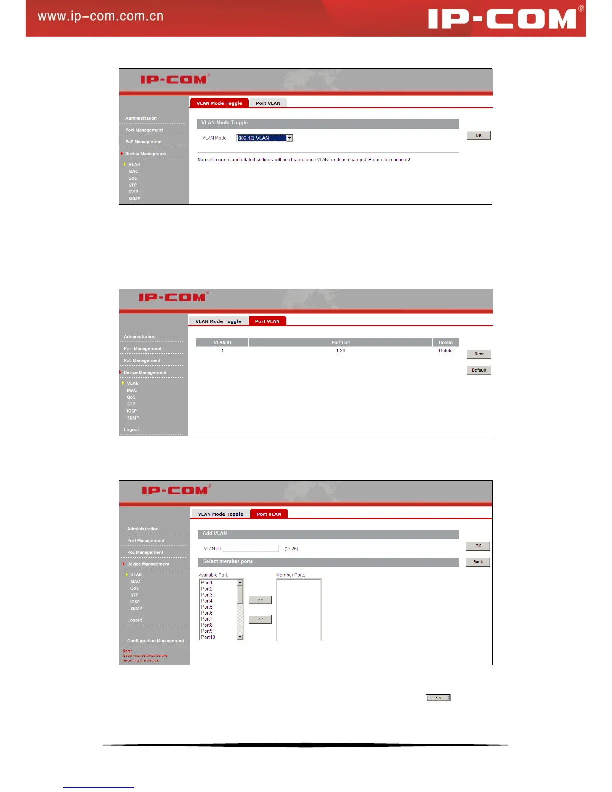 In port VLAN mode, click Device Management > VLAN > Port VLAN to enter the Port VLAN screen below: