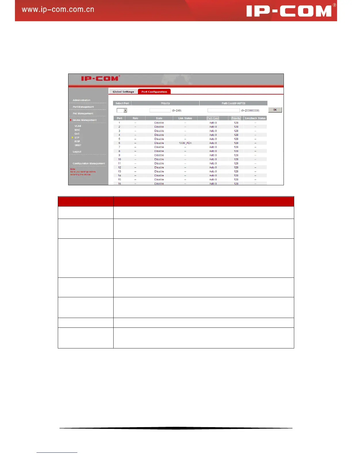 By default, all ports’ priority values are set to 128 and path cost complies with 802.1T standard as seen below.