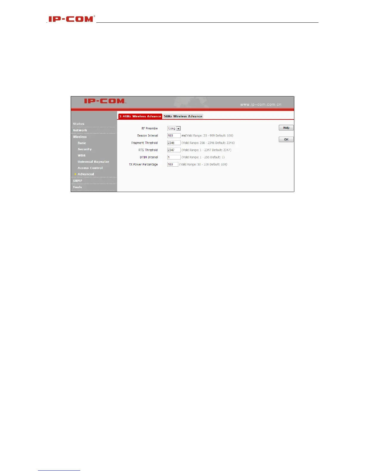 6. TX Power Percentage: Control TX power . Specify a value between 50 - 100. The default is 100.