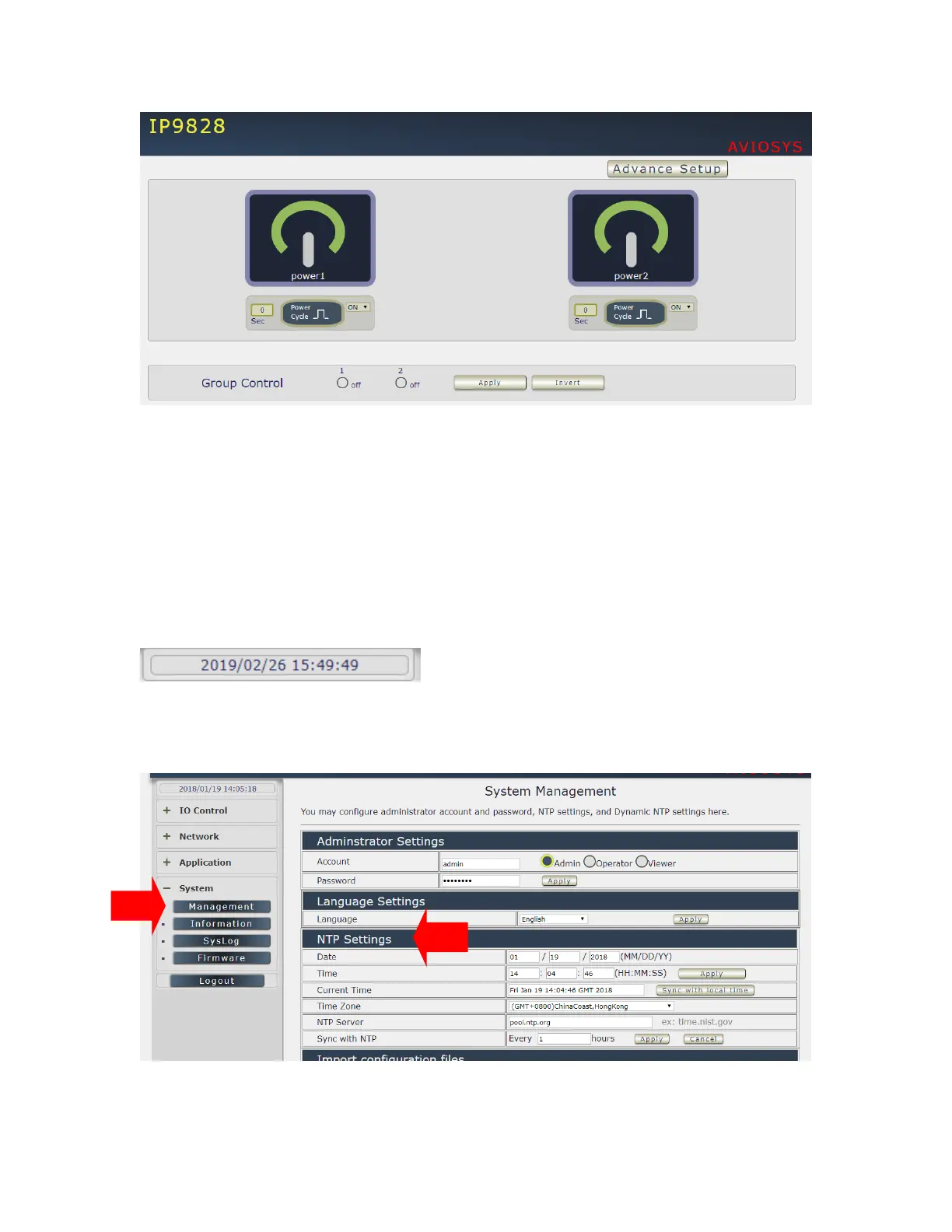 To setup the Time , Please go to “ System Management NTP Settings “ , please press