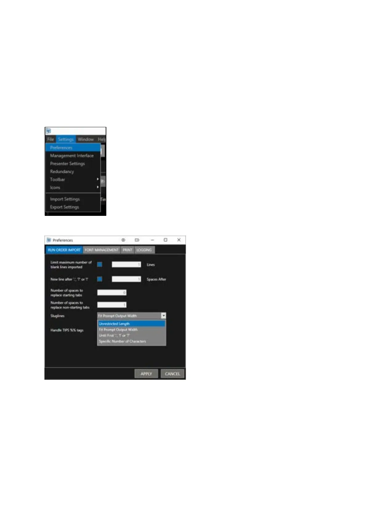 A pulldown in the Runorder Import tab offers 4 different slugline settings