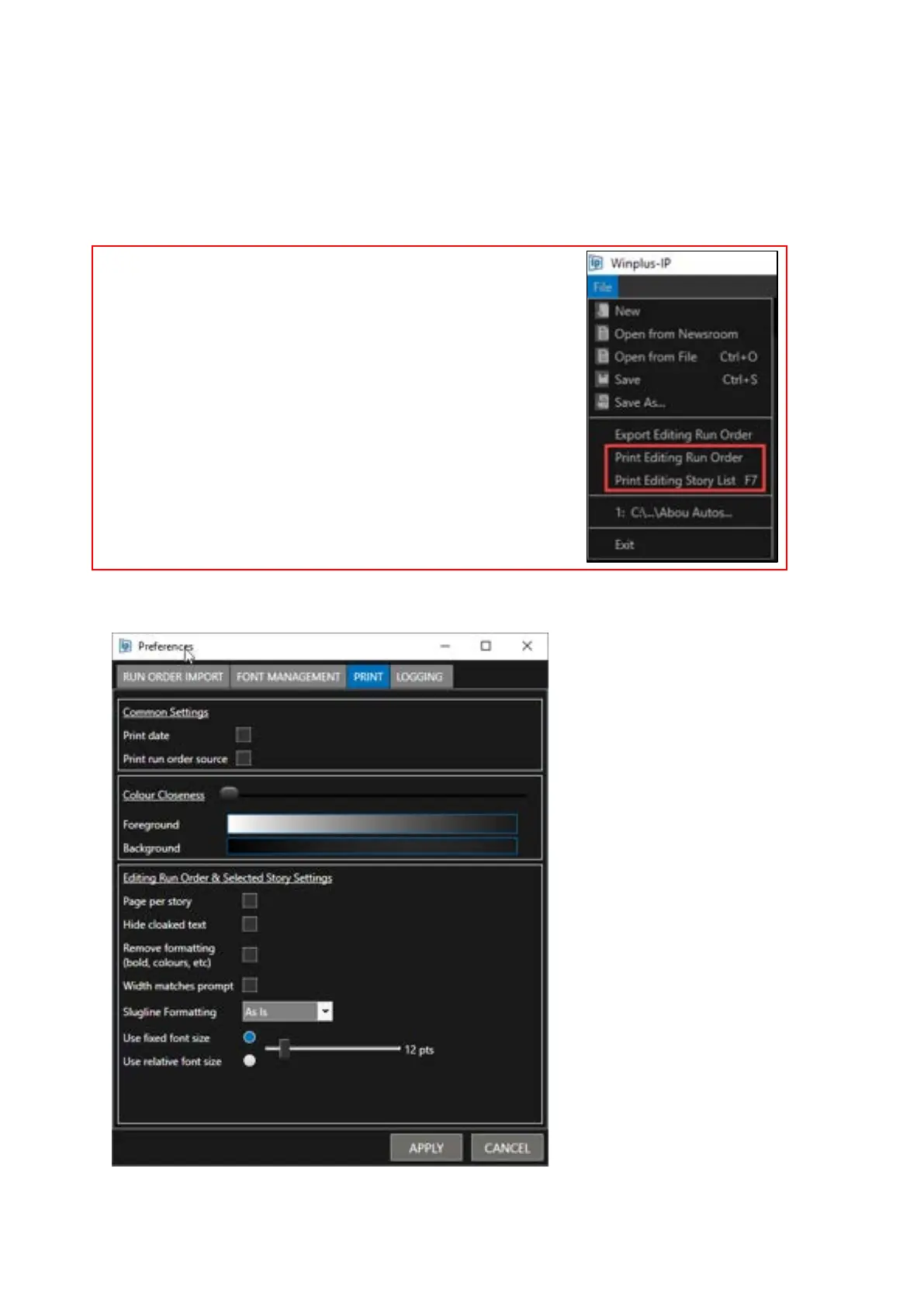 Printing options are accessed from Settings/Preferences in the main application toolbar and then