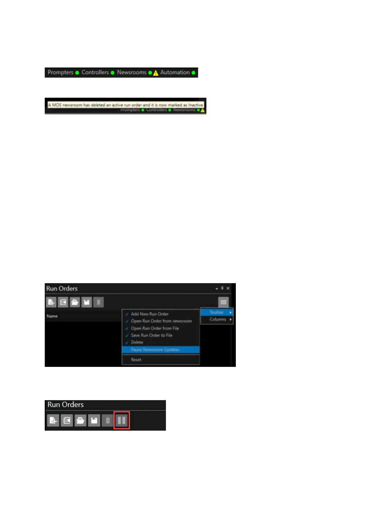 To access this feature, in the Run Orders pane, click the burger/Toolbar/Pause Newsroom Updates: