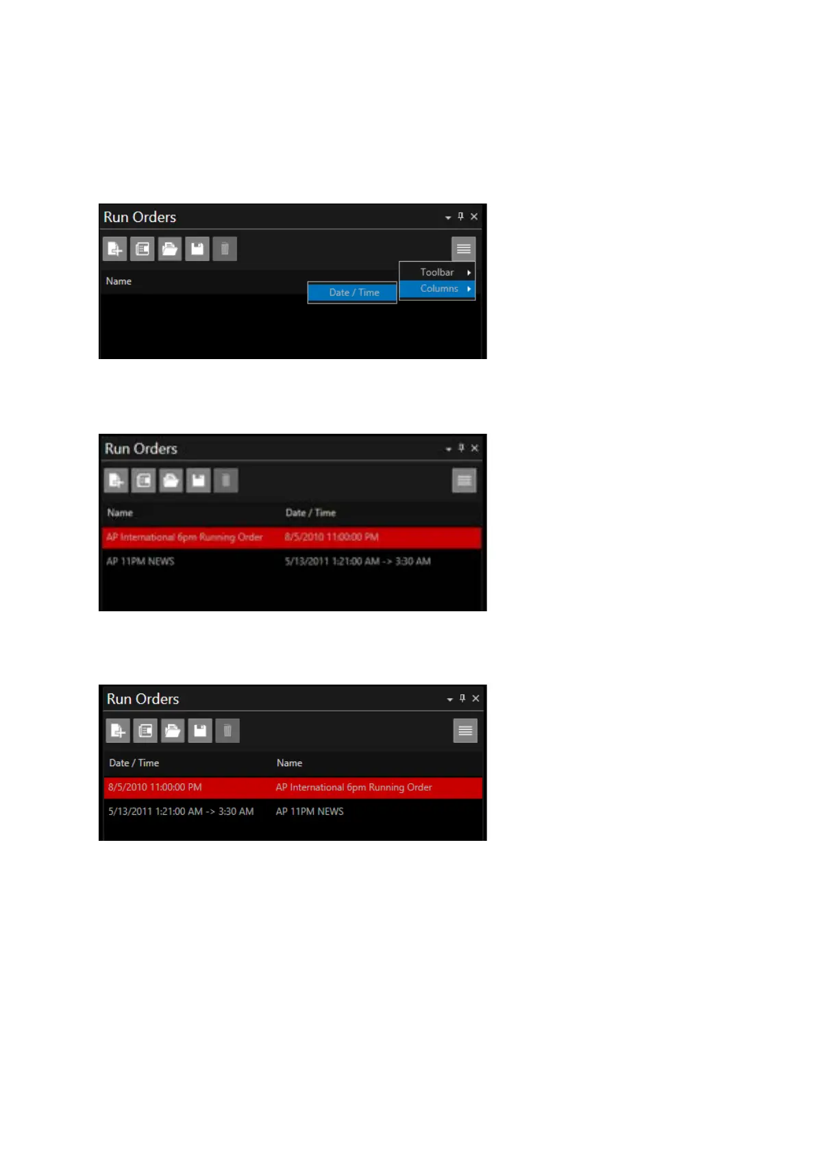 When run orders are loaded the associated date and time of that run order will be displayed