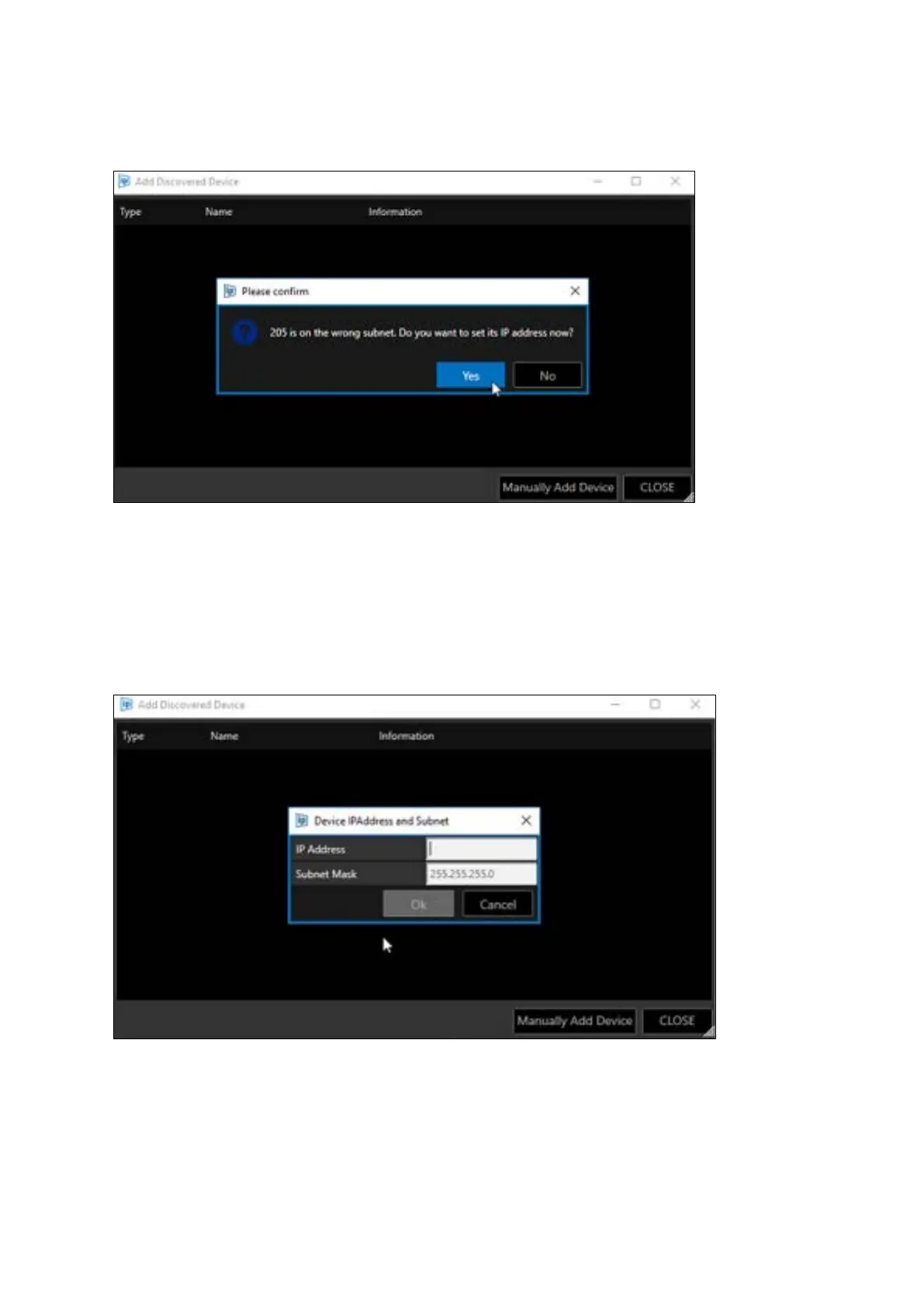 Click “Yes” to confirm and the Device IPAddress and Subnet window will open.
