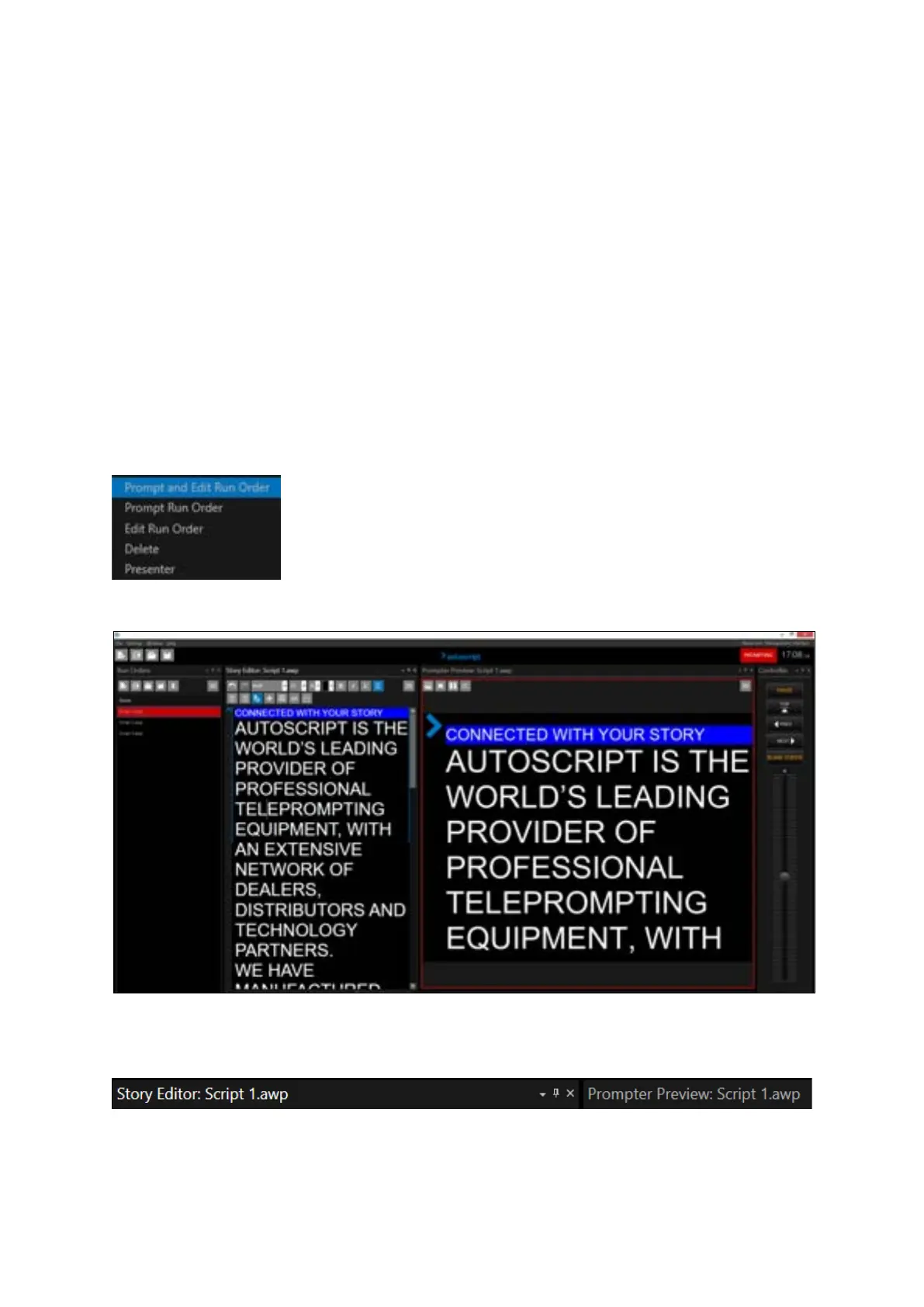 Script 1 is now in the Story Editor pane and the Prompter Preview pane (the live script).
